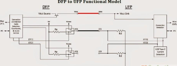 在DFP的CC pin有上拉電阻Rp,在UFP有下拉電阻Rd。未連接時,DFP的VBUS是無輸出的。連接后,CC pin相連,DFP的CC pin會檢測到UFP的下拉電阻Rd,說明連接上了,DFP就打開Vbus電源開關,輸出電源給UFP。 而哪個CC pin(CC1,CC2)檢測到下拉電阻就確定接口插入的方向,順便切換RX/TX。