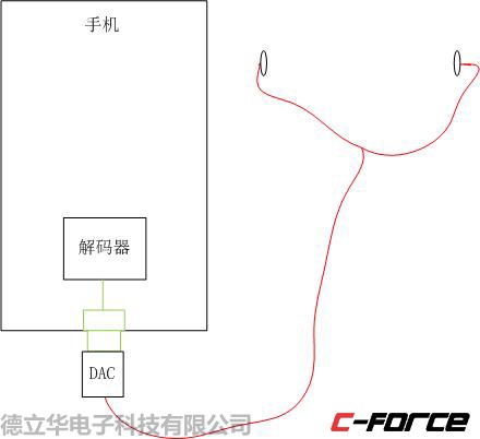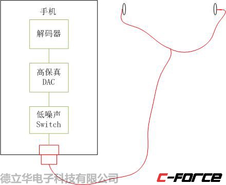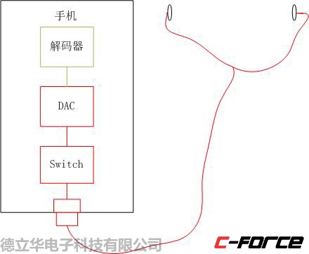 圖1為傳統模擬TYPE-C耳機音樂傳輸通道,紅色部分為音質損失,對于國產android手機來說,內置DAC已經對音質造成了最主要的音質損失。而且在進入TYPE-C口之前,還有個模擬開關用來切換音頻模式還是數字模式,然后經過TYPE-C接口,再經過耳機線,傳送到左右兩個揚聲器。其中,最重要的音質損耗在DAC部分,其他部分,只是理論上有損耗,未必真的損失聽覺效果。