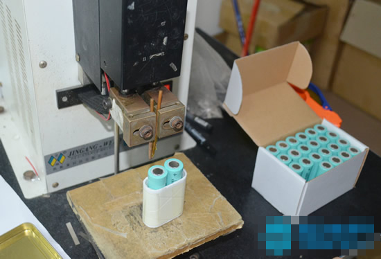 在組裝時,我們先要把兩節電芯用一個塑膠圈穩固住,旁邊的機器是點焊機,要把兩個鎳片焊接在上面。由于使用兩個組合的,必須要把每個電芯的正極和負極各自并聯起來。