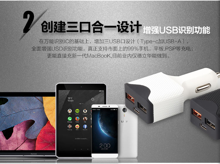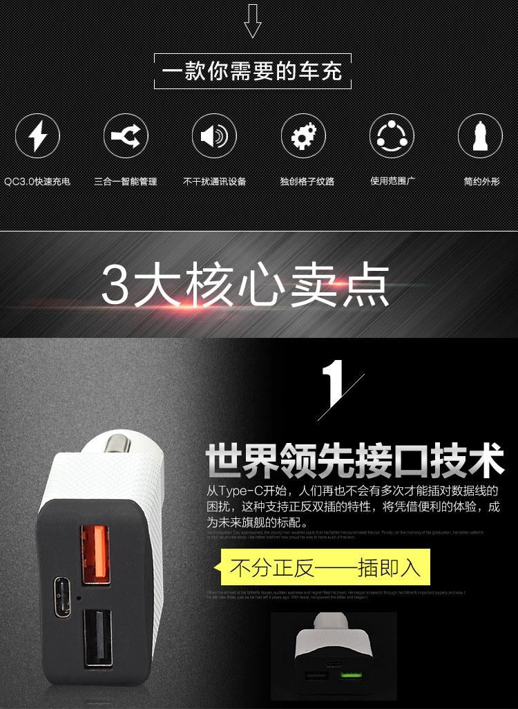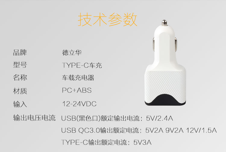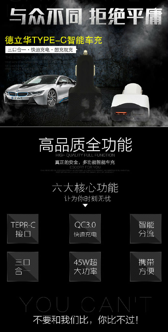 在這個爭分奪秒的時代,我們一直嘗試對車充做一些改變,意在讓其更快,更精致便捷,更安全時尚,德立華TYPE-C車充8190正是這種設想下的又一力作,8190搭載Quick Charge 3.0技術,經研發團隊全新的開發設計,充電速度極速提升,而且全部采用優質上等的內部和外部材質,品質安全放心!