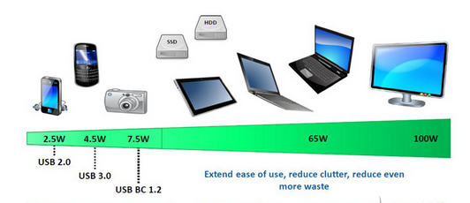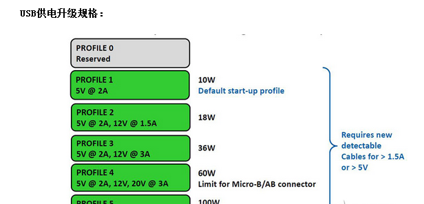 USB-IF(通用接口業界聯合組織)訂立出USB PD標準中,7.5W依然只以5V電壓供電,但10W、18W開始引入5V外的12V,60W與100W則再引入20V。雖然將供電力擴增至最高100W,但仍有纜線的區別,過往長久以來的標準USB纜線可以達最高的100W供電,但對于移動裝置常用的Micro-USB,因連接器較小,在物理限制下,最高只能供電60W,無法至100W。