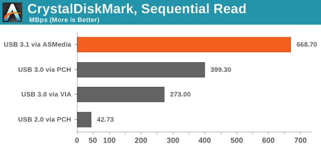 下面給大家看的在2015 CES上展示的X99芯片組橋接ASMedia祥碩ASM1352R橋接芯片獲得USB 3.1讀寫能力,而連接設備是同樣使用祥碩的USB 3.1-SATA 6Gb/s轉換方案ASM1352R的Raid0陣列兩塊Intel SSD 530 240GB,其連續讀寫性能可以達到668Mbps(我只挑選了這一個比較有代表性的指標),對比一下其它的數據你就明白差距了。