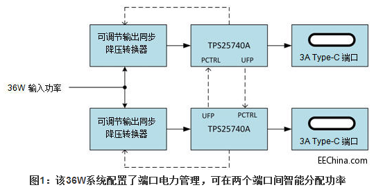 圖1所示的是一個36W雙Type-C端口系統(tǒng)使用端口電力共享的例子。起初,當兩個Type-C輸出端口未接入任何設備時,則均向外廣播滿額功率值36W。其中一個端口接入設備后,則該端口可支持以36W滿額功率對設備進行充電。由于接入了有效負載,該端口的UFP引腳信號輸出低電平,并同時將TPS25740A另一端口上的PCTL引腳拉低。因此,另一端口的廣播功率值降低到了18W。