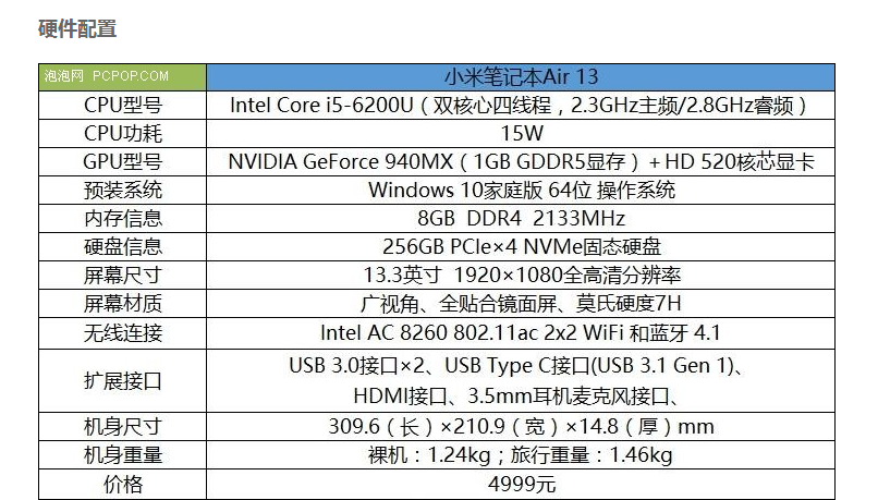 本次我們拿到的小米筆記本Air 13.3英寸版本,該機目前只有一個配置版本,具體配置為:Intel Core i5-6200U處理器、8GB內存、256GB固態硬盤、NVIDIA GeForce 940MX獨立顯卡,13.3英寸1920X1080分辨率的IPS屏幕,預裝Windows 10操作系統,硬件配置屬于主流水準,整機的售價為4999元,性價比相對出眾,開售日期還未確定。同時需要說明的是,本次評測產品為工程機,并非零售版。