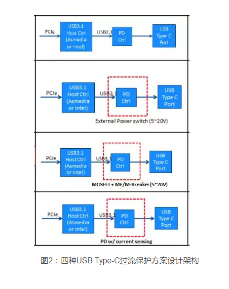 通常意義上的電路保護包括過流保護和過壓保護。USB Type-C的過流保護有四種不同的設計架構。第一種是直接采用集成了功率開關的PD控制器IC,這種方案的集成度較高,性能也最好,但是成本也比較高。